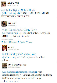 Aile hekimleri bugün yayınlanan yönetmeliğe karşı tepkilerini sosyal medyadan #ailehekimligindeNobeteHayir diyerek göstermeye başladı. Bazı twitler şu şekilde: