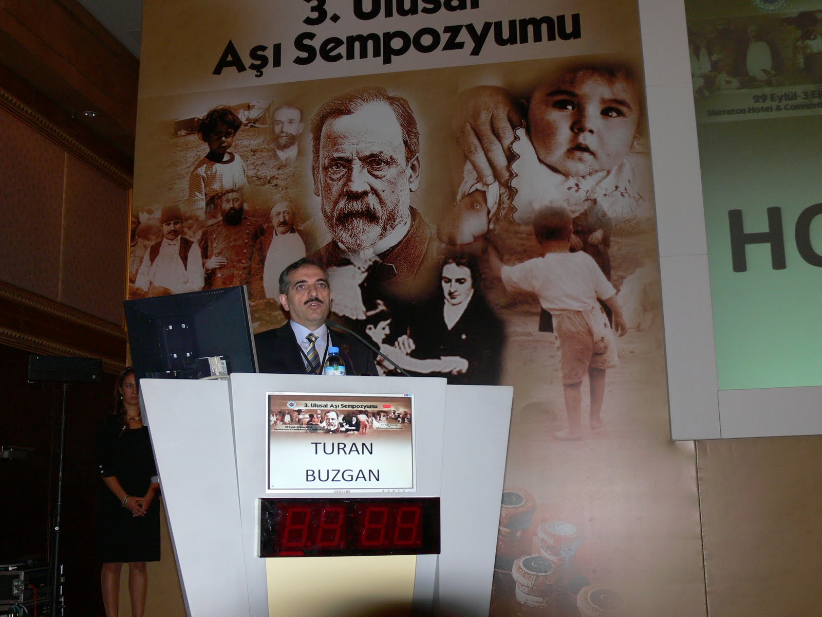 Türkiye’de aşının tarihçesini anlatarak genişletilmiş bağışıklama programında amacın hassas yaş gruplarına enfeksiyona yakalanmalarından önce ulaşıp bağışıklanmalarını sağlamak olduğunu kaydeden Sağlık Bakanlığı Müsteşar Yardımcısı Doç. Dr. Turan Buzgan, aşı ile korunulabilir bebek ve çocuk hastalıklarından kaynaklanan sakatlık ve ölümleri önlemek olduğunu ifade etti. 2008 yılı başından itibaren DaBT-İPA-Hib aşıları tek enjektör içinde uygulanmaya başlandığını bu şekilde bir seferde 5 hastalığa karşı aşılama yapılması sağlandığını belirten Buzgan, “Böylelikle 1 yaşına kadar 15 enjeksiyon şeklinde aşı yapılması gerekirken bu sayı 12’ye düşmüştür. Aşı ziyareti sayısı da 7 iken 6’ya düşmüştür. Aşı takviminde yer almayan aşılarla ilgili de, tanımlanmış risk gruplarına; grip, polisakkarid pnömokok aşısı, hepatit A aşısı sosyal güvenlik kurumları tarafından ödeniyor. Bağışıklama Danışma Kurulu tarafından ek olarak risk grupları tanımlanarak ve suçiçeği ile polisakkarit meningokok aşıları kapsama alınmasını da önerdik” dedi.