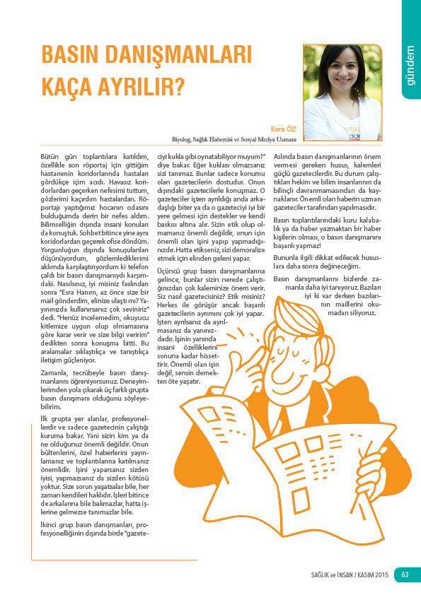 Aslında basın danışmanlarının önem vermesi gereken husus, kalemleri güçlü gazetecilerdir. Bu durum çalıştıkları hekim ve bilim insanlarının da bilinçli davranmamasından da kaynaklanır. Önemli olan haberin uzman gazeteciler tarafından yapılmasıdır.