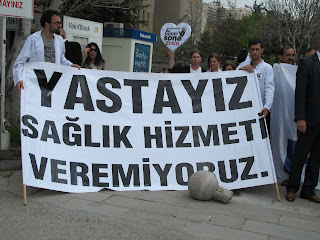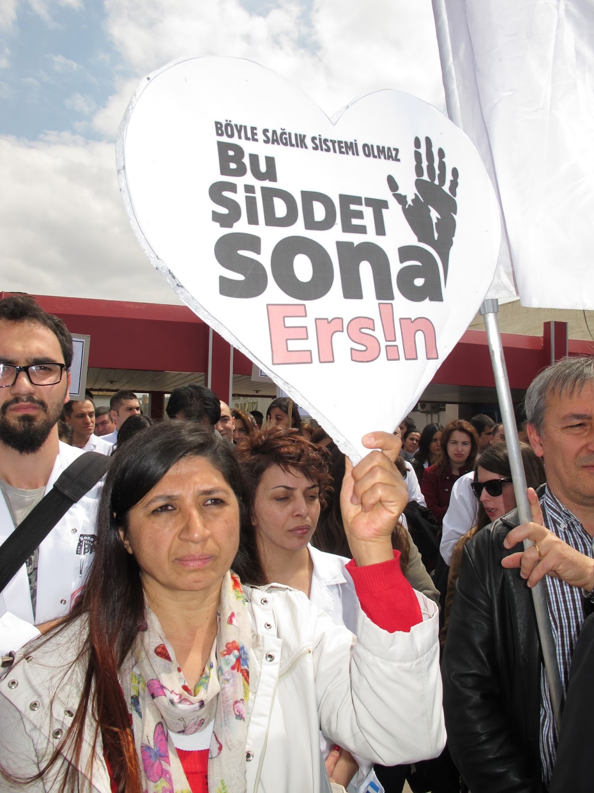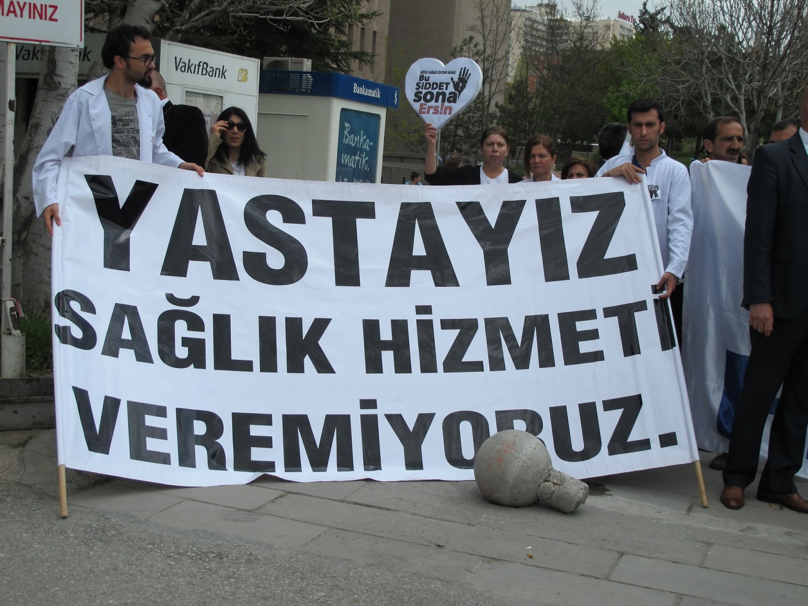 Hastane bahçesindeki eylemde, asistan hekimler adına konuşan Dr. İzzet Doğan, dün gece hastanelerinin endokrinoloji kliniğinde bir asistan hekimle hemşireye hasta yakını tarafından sözel ve fiziksel saldırı yapıldığını ve silahla ölüm tehdidinde bulunulduğunu öne sürdü. Yaptığı konuşmada, sağlık çalışanlarının çok sık şiddete maruz kaldığını söyleyen Doğan, “Artık hekimlik yapılamaz hale gelmiştir. Bakanlık hastayla sağlık çalışanlarını karşı karşıya getirici politikalardan vazgeçmelidir. Sağlıkta şiddet yasası bir an önce Mecliste kabul edilmelidir” dedi.