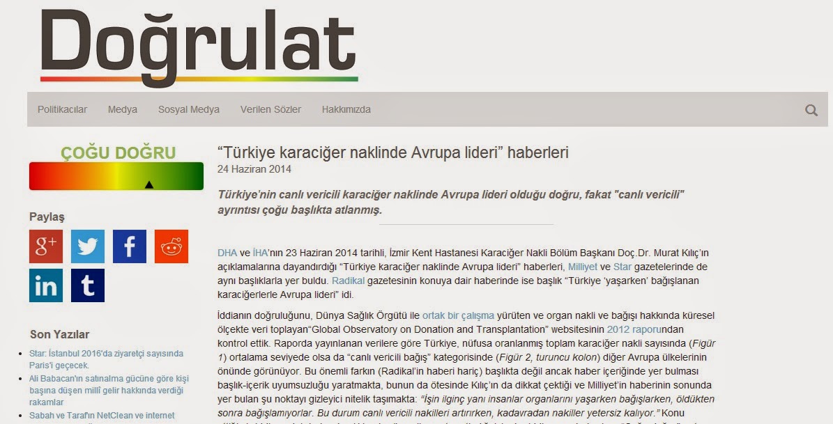“Fact checking” daha çok Amerika’da köklü bir habercilik alanı. Basit olarak, politikacıların ifadelerinde ve medya haberlerinde yanlış veya eksik bilgi olduğunda bunu açık kaynaklardan doğrulayan bir habercilik tarzı. En bilinen örneklerinden biri Amerikan İnternet sitesi Politifact; Pulitzer ödülü sahibi.