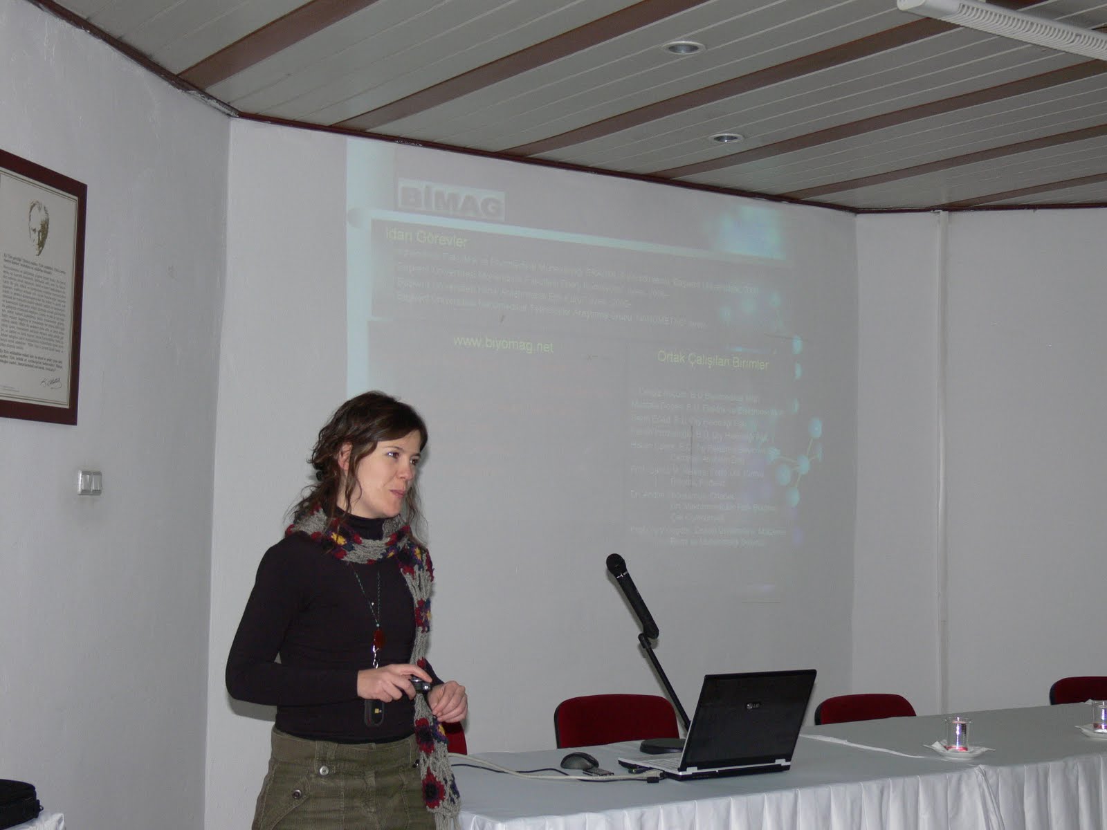 Biyosensör ve Nanoteknolojik Biyomalzemeler konusunda Yrd. Doç. Dr. Dilek Çökeliler bilgi vererek “Biyomalzeme araştırma grubu olarak çalışmalarımızı yürütüyoruz. Antibakteriyel yüzeylerde metal kaplamalar ile ilgili çalışmalar var. Diş hekimliği ve beyin-omurilik cerrahisi ile ortak yürüttüğümüz çalışmalar devam ediyor. Biyomalzeme üzerinde üretilen sistemlerin uygulaması üzerine çalışmalar yapıyorum. Bu kaplamaları nerelerde kullanılır. Bunu araştırıyoruz”diye konuştu. Ayrıca Yrd. Doç. Dr. Metin Yıldız, Biyomedikal Enstrümantasyon ve Sinyal işleme, Arş. Gör. Mehmet Feyzi Akşahin ve Mühendis Erhan Ermek Polisomnograf Uygulamaları ve Arş. Gör. Tuncay Bayrak QCM Biyosensörler üzerine sunum yaptılar.