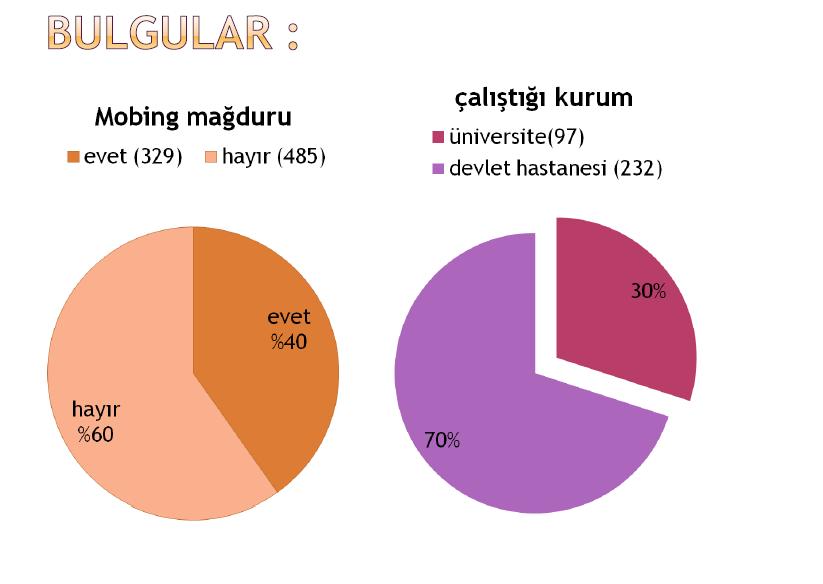 Mağdur hemşirelerin yüzde 58’i devlet hastanesinde çalışıyor. Yüzde 89’u hemşire statüsünde, ortalama 10-6 yıllık deneyime sahip, 31- 35 yaş ortalamasında ve yüzde 61’i evli, yüzde 56’sı da çocuk sahibi. Ülkemiz sağlık sektöründe mobbing, diğer mesleklere göre hemşirelere uygulanan şiddet çok daha yaygın. Mağdur hemşirelerin yüzde 46’sı çalıştığı hastaneden ve yöneticilerinden memnun değil ve yüzde 46’sı fırsatı olsa hemşireliği bırakıp başka bir işte çalışmak istiyor. Devlet hastanesinde daha fazla hemşire mobbing mağduru olmasına rağmen, üniversite hastanesinde çalışan hemşirelerde devlet hastanelerinde çalışanlara göre daha ağır mobbing yaşadığı saptandı. Mağdur hemşirelerin yüzde 23’ü halen, yüzde 35’i 3 yıl ya da üstünde ve yüzde 30.9’u kıskançlık nedeniyle mobbing yaşadığını belirtti. Hemşirelerinde yüzde 53’ü mobbing durumunu arkadaşları ve ailesi ile paylaşıyor. Mağdur hemşirelerin yüzde 76’sı kurumlarında bir başkasına mobbing uygulandığını belirtiyor. Mobbing uygulayanların yüzde 54’ü yönetici, yüzde 45’i kadın, yüzde 16’sı da kadın ve erkeklerden oluşan bir grup tarafından mobbing saldırılarına maruz kalıyor. Mobbing nedenleri arasında kıskançlık, işteki başarılar, dünya ve yaşam hakkındaki görüşler, nedensiz, yetenekler, dış/fiziksel görünüşüm, yaşam tarzı, eğitim durumu, dini inanç/inaçlar, siyasi görüşler, medeni durum ve işteki başarısızlıklar yer alıyor. Hastanelerde yaşanmaması gereken mobbing yaklaşık 1/6 oranında uygulanıyor ya da yaşanıyor. Ayrıca mobbing ölçeği güvenilir ve geçerlidir. Hemşireler kullanılabilir. Hemşirelerin yaklaşık yarısı kurumlarından, mesleklerinden memnun değillerdir ve fırsatları olsa başka bir işte çalışmak istiyor.”