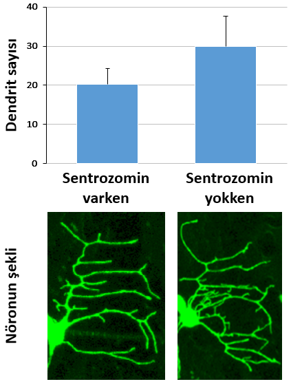 Biz bu aracının sentrozomin adlı bir protein olduğunu bulduk. Sentrozomin proteinini üretemeyen, genetiği değiştirilmiş sinek larvalarını inceledik. Normalde basit dendritlere sahip olması gereken hücrelerin daha karmaşık, ve yaklaşık yüzde 50 daha çok dendrite sahip olduğunu gördük” dedi. (Şekil 3)