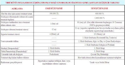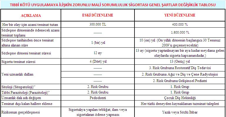 Mesleki sigortada düzenlemesinde yapılan değişiklerle her bir tıbbi hatalı uygulama için azami teminat tutarı 300 bin TL’den 400 bin TL’ye yükseltildi ve her durumda sözleşme kapsamında ödenecek yıllık tazminat miktarı için ise 1 milyon .800 bin TL olarak belirlendi. Sözleşme tarihinden önce bir yıl olan teminat süresi 30 Temmuz 2009’u geçmemek şartıyla on yıla çıkarıldı.