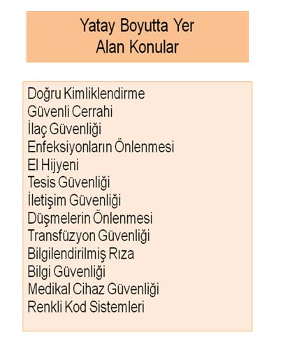 Türkiye’de tüm hastalara hizmet eden kamu, özel ve üniversite hastaneleri için ortak bir hastane hizmet kalite standardı hazırlandı. Hazırlanan bu hastane hizmet kalite standartlarında bir boyutlandırma çalışması yapıldı. Boyutlandırma çalışmasında; dikey ve yatay boyutlar yer alıyor. Dikey boyutlarda hastanede hizmet veren tüm bölümleri ele aldık. Bunlar arasında; sağlık hizmeti sunulan bölümler, birebir sağlık hizmet sunumu yapmayan ancak sağlık hizmeti sunan bölümlere destek olan destek hizmet bölümleri ve bunların her ikisine birden kurumsal olarak hizmet eden kurumsal hizmet yönetimi yer alıyor. Üç dikey boyuta ilave olarak hasta-çalışan güvenliği, hasta-çalışan memnuniyeti olarak da yatay bir boyutlandırma çalışması yaparak kendi standart modelimizi oluşturduk.